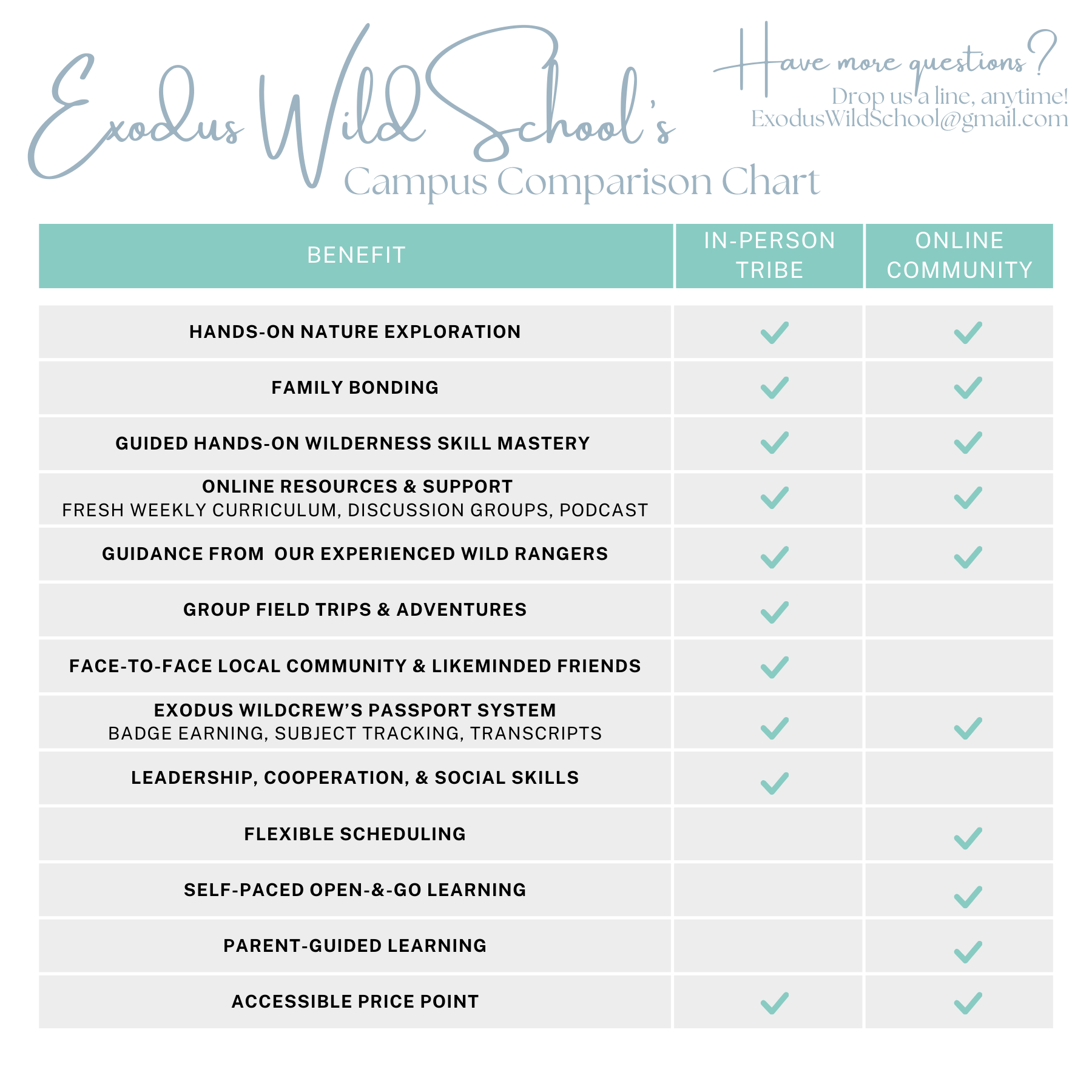 Exodus WildSchool is a fully-immersive nature-&-faith-based homeschool collaborative, offering a thriving online community & multiple in-person campuses (Tribes)… with more to come.